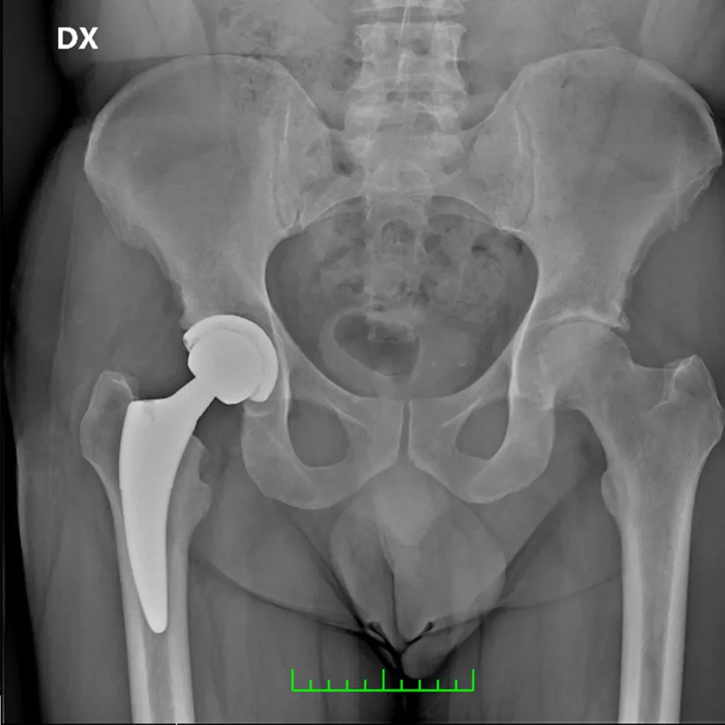 Anca destra sostituita dalla protesi, con corrette dimensioni delle componenti e ottimo ripristino dei parametri biomeccanici.